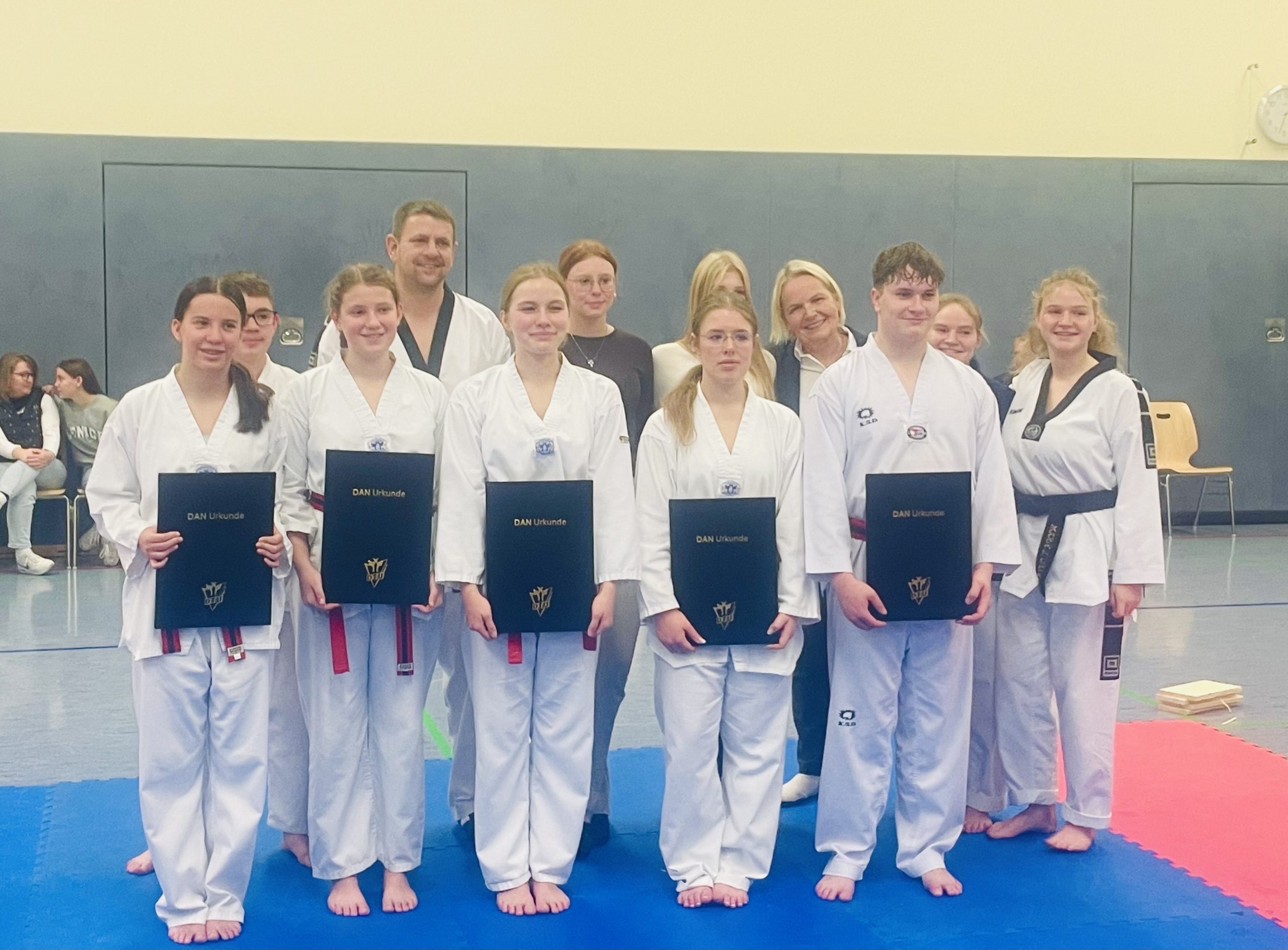 Ein besonderer Höhepunkt folgte um 13:15 Uhr: Fünf Sportlerinnen und Sportler stellten sich der Dan-Prüfung zum Schwarzgurt. Clara Hartmann, Marvin Eberlein, Hannah Augst, Lina Fischer und Enya Happ erreichten diesen Meilenstein im Taekwondo. Dieses außergewöhnliche Ereignis unterstreicht die erfolgreiche Nachwuchsarbeit der Abteilung. Die Prüflinge haben vor ca.8 Jahren über einen Anfängerkurs den Weg zum Taekwondo in Mensfelden gefunden und nun nach vielen Jahren des Trainings stand der vorläufige Höhepunkt, nämlich ihre Schwarzgürtelprüfung, an.